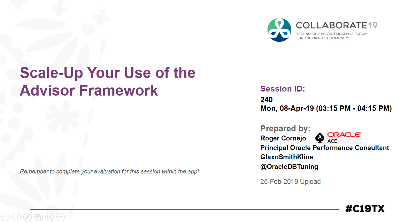 Transform your ability to quickly respond to the challenge of ensuring high performing DB’s. The key to this transformation is to expertly use the advisor framework which underlies tools such as ADDM, SQL Tuning Advisor, Segment Tuning. These tools provide actionable advice to the DBA seeking to solve performance problems but getting at this information can be painstaking. This presentation shows you many undocumented ways to proficiently use the underlying data to quickly get to tuning solutions.
